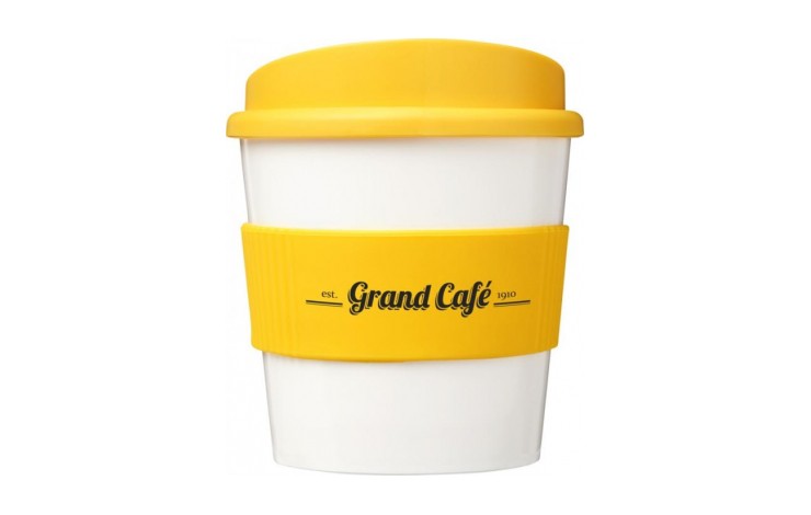 British made. Choose from thirteen glossy colours, or have your full colour design moulded into the mug itself. Supplied with a silicone grip, which you can also print to, and a clip-on lid with a matt finish. BPA free and top-rack dishwasher safe.