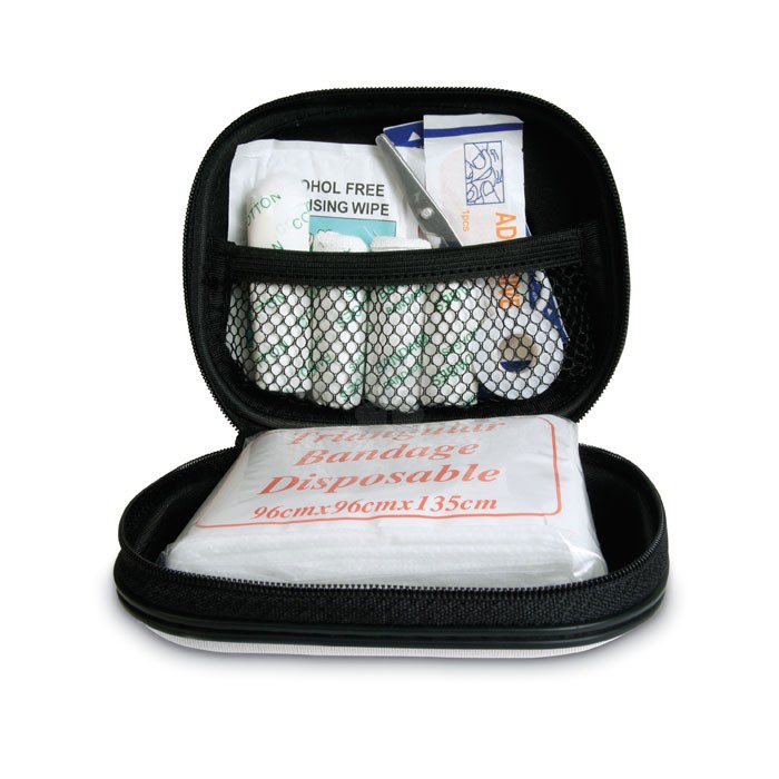 Each case contains the following items as standard: 1 pair of scissors, 3 pad bandages, 1triangular bandage, 1 roll of cotton, 2 cleaning tissues, 5 adhesive bandages, 1roll of tape and 6 cotton buds.