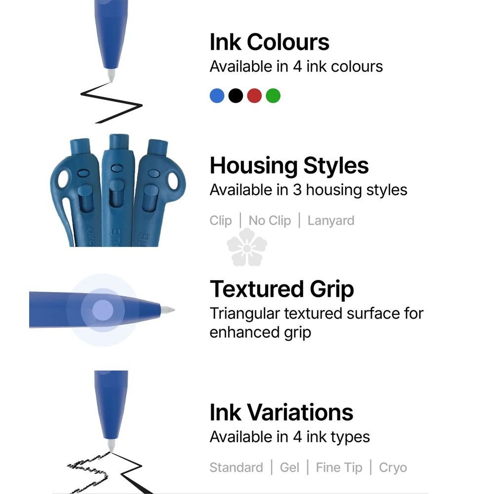4 ink colours to choose from (Black, Blue, Green and red) with the barrel available in 9 different colour options making this great option to stay inline to your brand colours