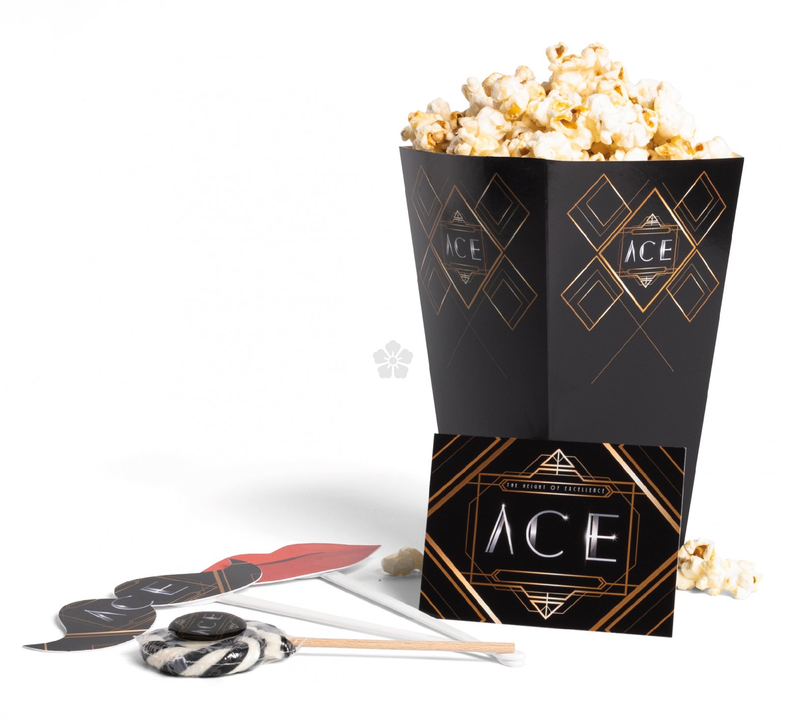 This low budget set comes with a range of personalised & stocked item products including: 1x Popcorn Box (Branded), 4x Selfie Props (Branded), 1x Swirly Lollipop (Branded), 1x Message Card (Branded), 1x Popcorn Bag.